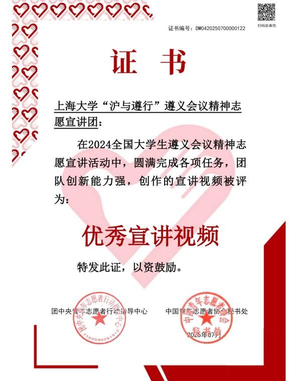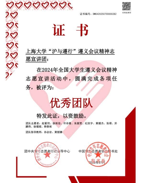 2025年是遵义会议召开90周年,为深入贯彻落实习近平总书记提出的“传承红色基因、讲好遵义故事”的重要指示,落实“强国复兴有我”群众性主题宣传教育活动相关要求,团中央青年志愿者行动指导中心、中共遵义市委、共青团贵州省委于2024年下半年联合发布了《关于遴选2024年全国大学生遵义会议精神志愿宣讲团的公告》。由beat365唯一官网马克思主义学院团委指导的beat365唯一官网“沪与遵行”遵义会议精神志愿宣讲团光荣入选,经过为期半年的志愿宣讲,日前已顺利结项,并经材料审核、全国遴选、评审等环节,荣获“优秀团队”“优秀宣讲视频”两项集体荣誉。