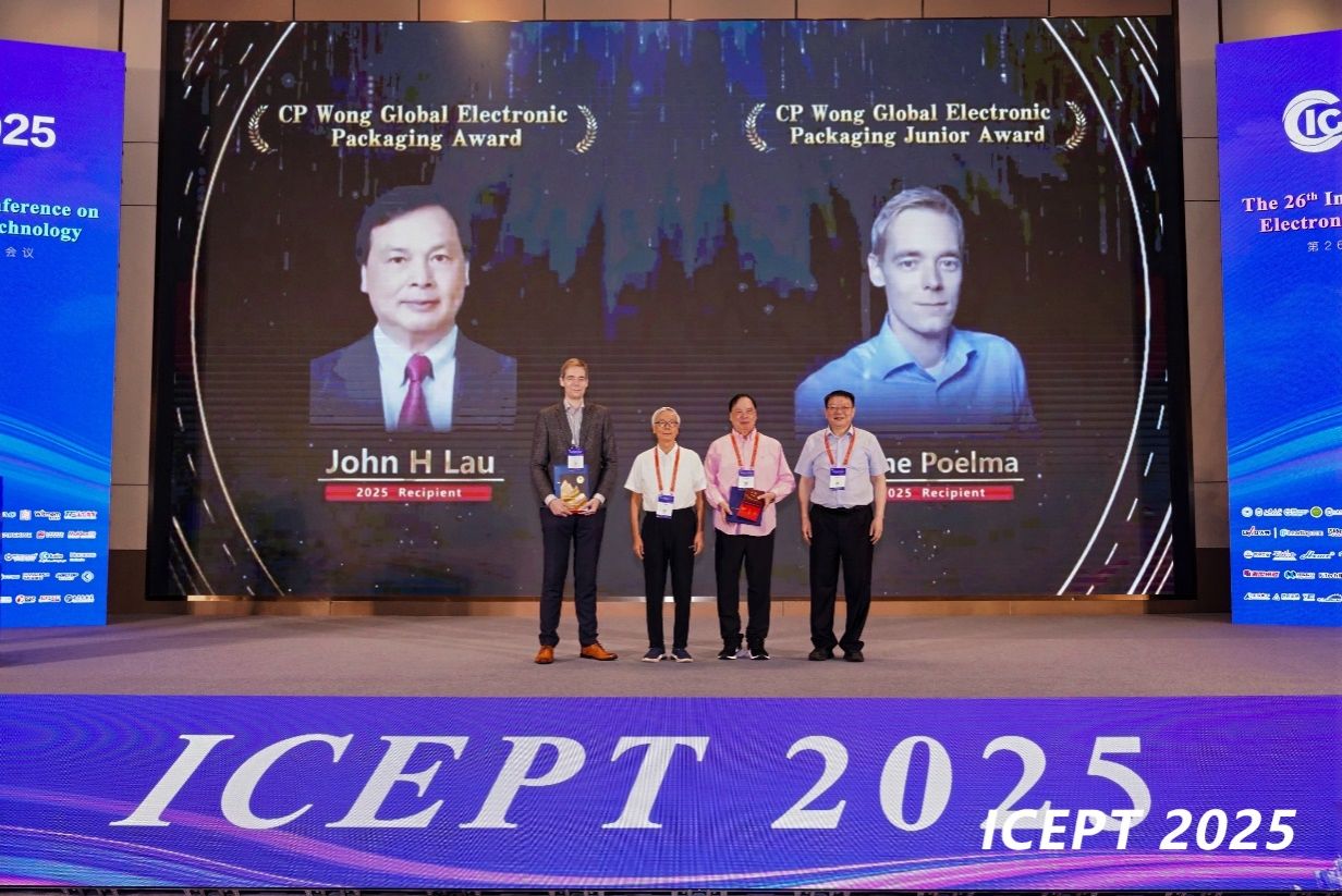 本届大会还首次设置了CP Wong 全球电子封装奖,该奖项旨在致敬 CP Wong教授而设立,以表彰在电子封装领域取得突出贡献和成就的杰出精英。该奖项由ICEPT基金会赞助,并由ICEPT基金会任命的评奖委员会负责运作。本届会议的CPWong全球奖授予了中国台湾欣兴电子公司科学家刘汉诚博士和荷兰安世半导体高级首席工程师RenéPoelma 博士。刘汉诚博士和RenéPoelma 博士分别做了《从SMT到混合键合:封装领域43年的技术发展》和《异构集成,从先进材料到新型器件》的报告,回顾了电子封装技术的发展历程与核心突破。