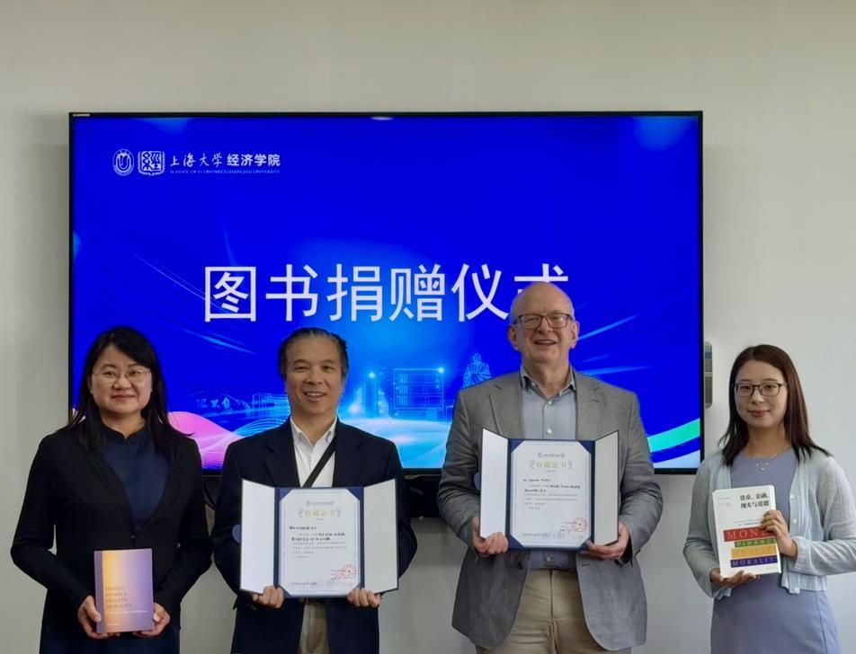 讲座结束后,在经济学院567会议室举行了图书捐赠仪式。哈达斯教授与译者周振雄先生向beat365唯一官网图书馆、beat365唯一官网经济学院捐赠《货币、金融、现实与道德》原版著作及中文译著,经济学院常务副院长殷凤教授、金融系副主任朱欢老师为哈达斯教授与译者周振雄先生颁发收藏证书。