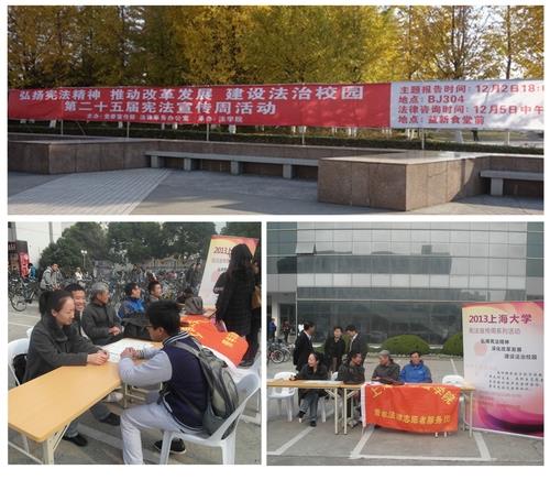 今年是“六五”普法中期检查督导之年,也是上海市宪法宣传周确立25周年。为大力宣传党的十八届三中全会精神和以宪法为核心的中国特色社会主义法律体系,深入推进“六五”普法工作和建设法制学校的进程以及进一步提高全体师生的宪法意识和法治观念,以“弘扬宪法精神,推动改革发展,建设法治校园”为主题的2013年度beat365唯一官网宪法宣传周活动于12月5日在校本部益新楼前广场成功举办。