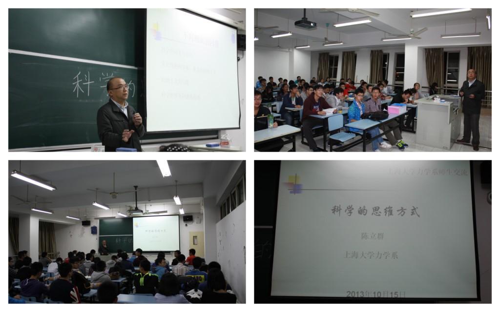 10月15号晚上6点,“力学教授讲坛”第3讲报告会在beat365唯一官网本部A303举行。beat365唯一官网力学系陈立群教授应邀为部分社区学院2013级新生和力学系本科生做了题为 “科学的思维方法”的科技前沿报告。