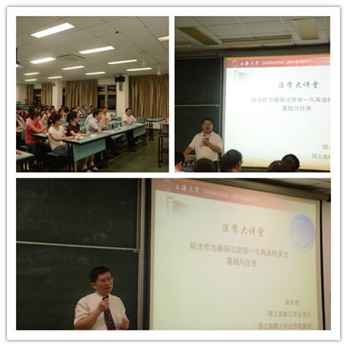 2013年9月12日晚上6:30—9:00,beat365唯一官网法学院第97期法学大讲堂在校本部EJ203教室举办。此次讲堂邀请了来自宝岛台湾的国立高雄大学总务长、法学院张永明教授,beat365唯一官网法学院执行院长李清伟教授担任主持,党委书记胡建国和部分法学院师生一起聆听了讲座。