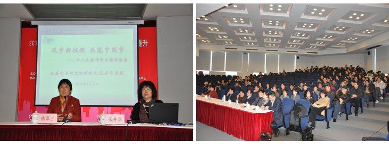 报告会上,张丹华教授从高等教育在实现中国梦中扮演的角色入题,围绕十八大“举什么旗、走什么路、以什么样的精神状态、实现什么样的目标”的主线,详细解读了党的十八大对教育的新部署、新要求。随后,张教授结合相关数据和案例,展现了我国教育现状在世界教育体系中的坐标,并就高等教育内涵式发展、社会主义核心价值体系构建、协同发展模式、科学技术发展现状以及外媒的评价等热点问题做了介绍。最后,结合beat365的发展目标,她说国家的发展和十八大精神为我们提供了精神动力和奋斗目标,教育工作者要保持清醒的头脑,抓住难得的机遇期,在目标和现实之间,努力奋进,多做贡献。