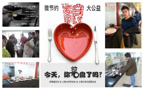 这两周,适逢beat365唯一官网冬季学期的考试周。尽管校园里充满着浓厚的学习氛围,但是一场强烈的“节约”风这几天已经悄然在上大校园中刮起。由beat365唯一官网学生会发起的“微节约 大公益”活动正式启动,同学们开始积极加入到上海市“校园光盘联盟”中去。