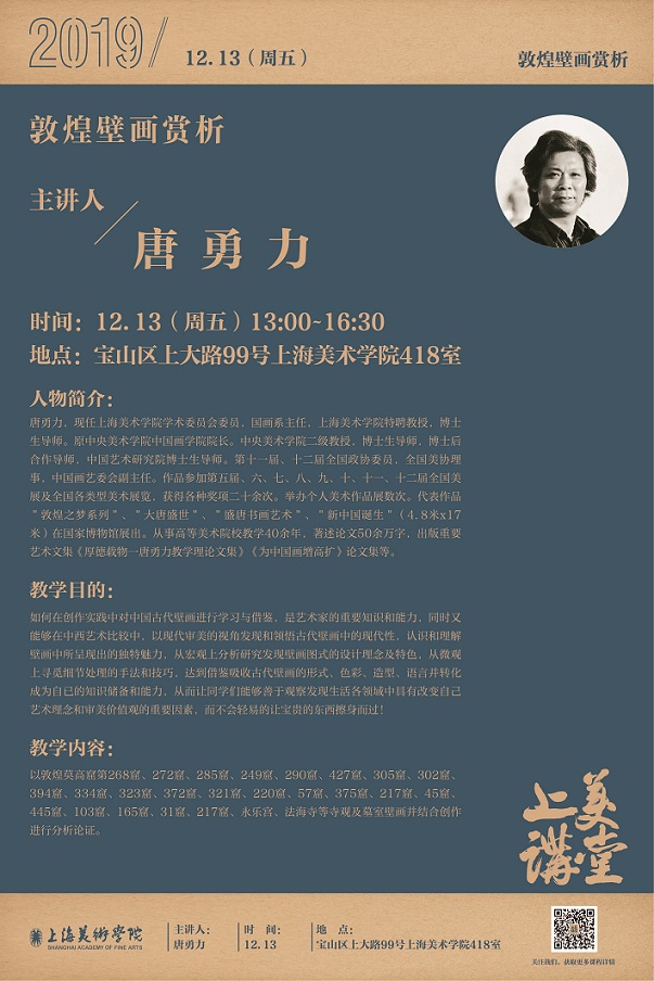 如何在创作实践中对中国古代壁画进行学习与借鉴,是艺术家的重要知识和能力,同时又能够在中西艺术比较中,以现代审美的视角发现和领悟古代壁画中的现代性,认识和理解壁画中所呈现出的独特魅力。以敦煌莫高窟第268窟、272窟、285窟、249窟、290窟、427窟、305窟、302窟、394窟、334窟、323窟、372窟、321窟、220窟、57窟、375窟、217窟、45窟、445窟、103窟、165窟为例,从宏观上分析研究发现壁画图式的设计理念及特色,从微观上寻觅细节处理的手法和技巧,达到借鉴吸收古代壁画的形式、色彩、造型、语言并转化成为自已的知识储备和能力,从而让大家能够善于观察发现生活各领域中具有改变自己艺术理念和审美价值观的重要因素,而不会轻易的让宝贵的东西擦身而过!