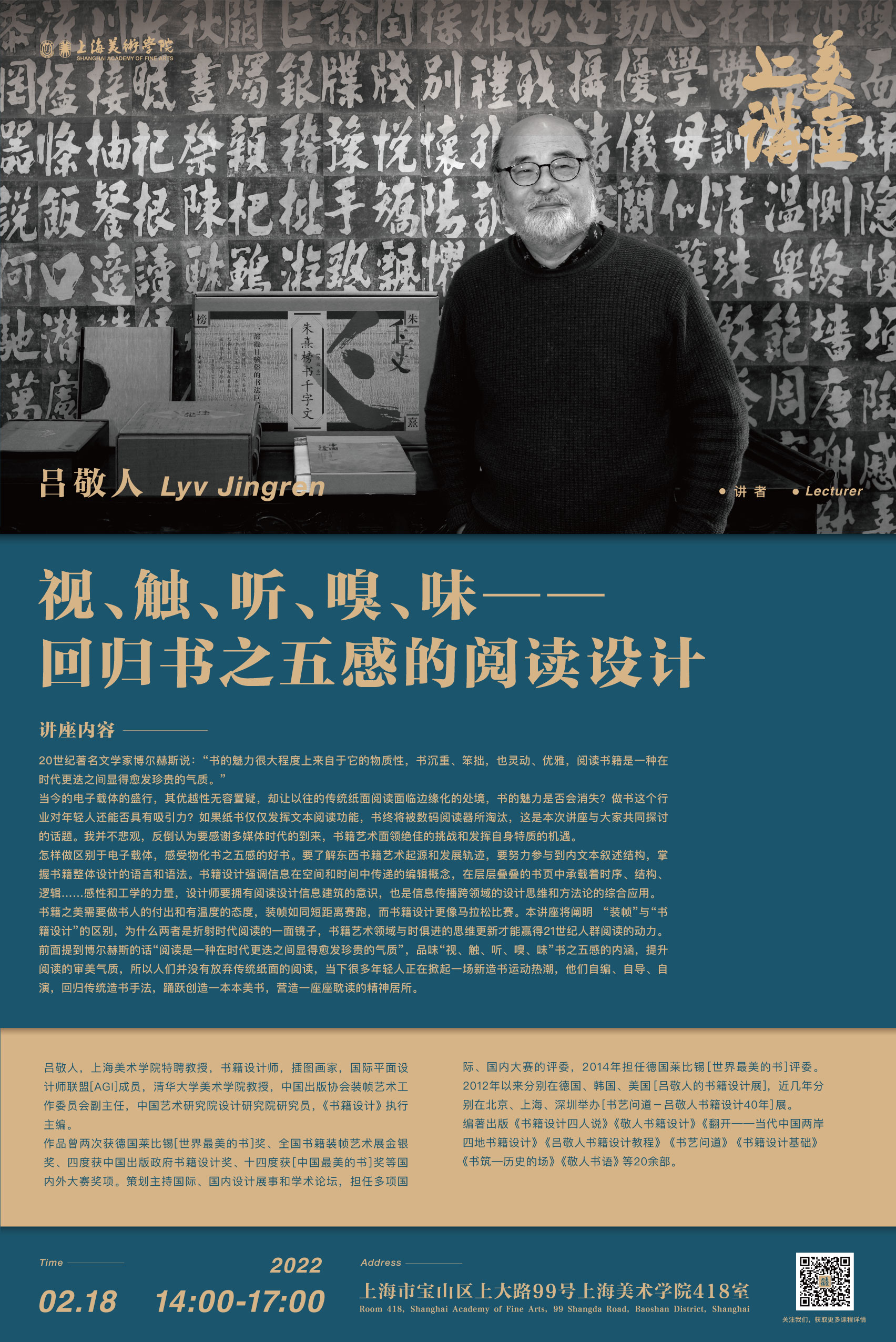 个人简介:吕敬人,1947年生于上海。书籍设计大师、插图设计大师、视觉艺术家,AGI国际平面设计协会会员。师从神户艺术工科大学院杉浦康平教授,现任清华大学美术学院教授,beat365唯一官网上海美术学院特聘教授。中国出版工作者协会书籍装帧艺术委员会副主任,全国书籍装帧艺术委员会副主任、中央各部门出版社装帧艺术委员会主任,中国美术家协会插图装帧艺术委员会委员。